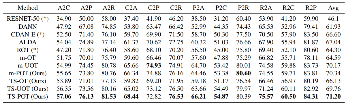 To validate the performance of the proposed methods, we carry out experiments on deep domain adaptation (DA). We observe that m-POT gives better-adapted classification accuracy on all datasets than the previous methods. Moreover, the two-stage training significantly improves the performance of DA on Office-Home and VisDA for both optimal transport and partial optimal transport.