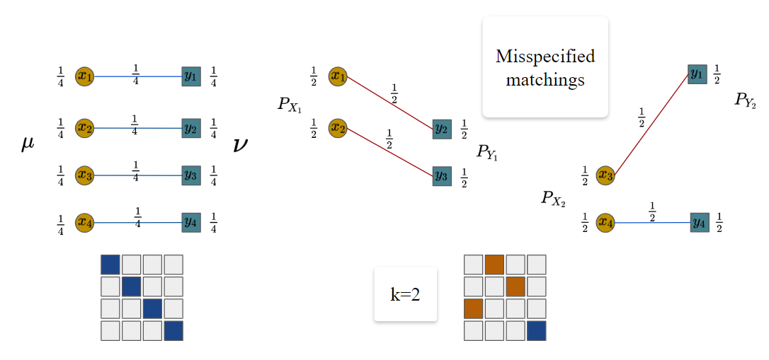 In Figure 3, POT gives the exact 2 matchings, alleviating the misspecified matchings issue.