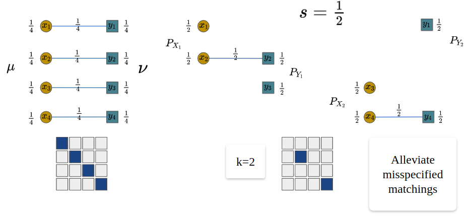 \[\begin{equation} \text{POT}^s(\mu, \nu) = \min_{\pi \in \Pi_s(\mu, \nu)} \langle C,\pi \rangle \end{equation}\]where \(\Pi_s(\mu, \nu) = \{ \pi \in \mathbb{R}_{+}^{n \times n} \mid \pi 1 \leq \mu, \pi^T 1 \leq \nu, 1^T \pi 1 = s \}\) is the set of admissible transportation plans between \(\mu\) and \(\nu\).