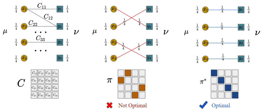 Let \(\mu,\nu\) be discrete distributions of \(n\) supports, i.e. \(\mu := \frac{1}{n} \sum_{i=1}^n \delta_{x_i}\) and \(\nu := \frac{1}{n}\sum_{j=1}^{n} \delta_{y_j}\). Given distances between supports of two distributions as a matrix \(C\), the Optimal Transport (OT) problem reads: